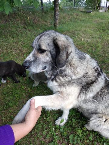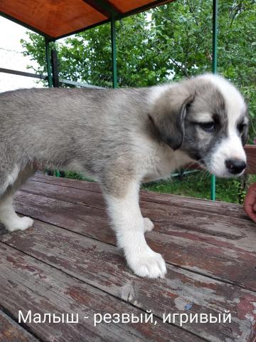 Щенок от общей деревенской собаки с кавказской кровью и сильными сторожевыми инстинктами!Рожден в середине апреля 2018г.Здоров, привит, с паспортом! Мальчишка,серый с белыми полосами,вырастет