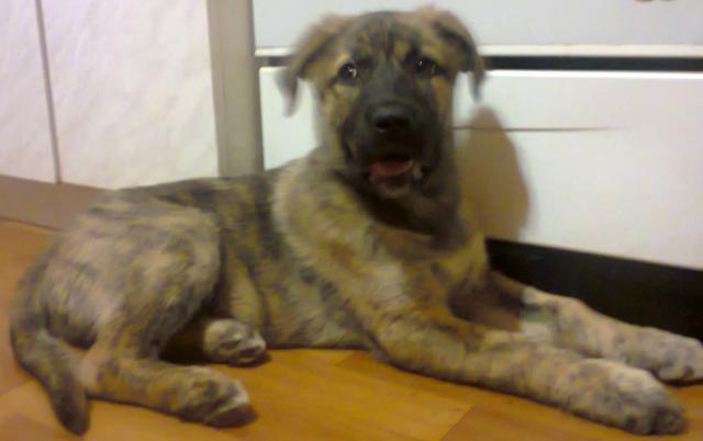 Если Вы говорите о степных короткошерстных кавказских овчарках то щенку около 2 месяцев. А окрас вполне типичный. А если реально тот возраст о котором пишет хозяйка то 50-60 кг не светит )))