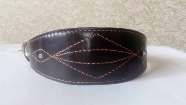 В моей мастерской я изготавливаю только кожаную амуницию, с использованием специализированной сварной фурнитуры, в основном для собак крупных пород ) Кожа, так же, используется только ременная, очень толстая. Все ошейники двойные, прошиваются только вручную вощеной нитью седельным швом...