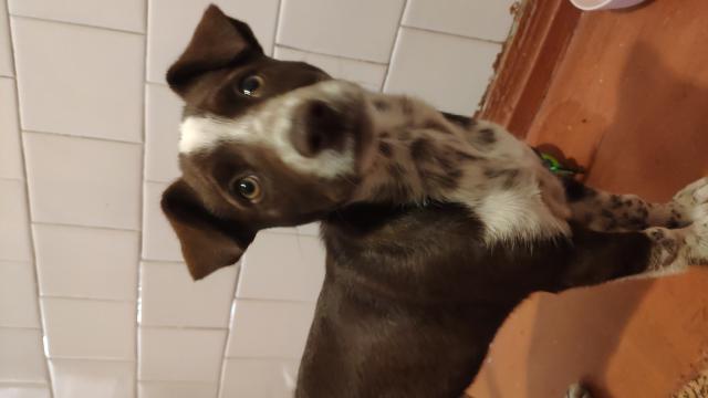 Беспородная,однозначно.Возможна примесь русского спаниеля,видно по окрасу на груди и лапках.Если правильно воспитаете,думаю никакой опасности для детей представлять не будет.Собаки-девочки по характеру спокойнее и преданнее.