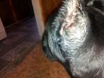 На пятом месяце жизни на месте одного из швов появилась гнойная опухоль. Чистка ветеринаром с использованием местной анестезии особых результатов не дала, так как нить обнаружить не удалось - на 10-е примерно сутки она теряет пигментацию, становится "прозрачной" и её очень сложно обнаружить в воспаленной ткани. Защитный воротник, антибиотики, промывания. Уж очень хотелось обойтись без операции... Мануальная чистка, промывание.