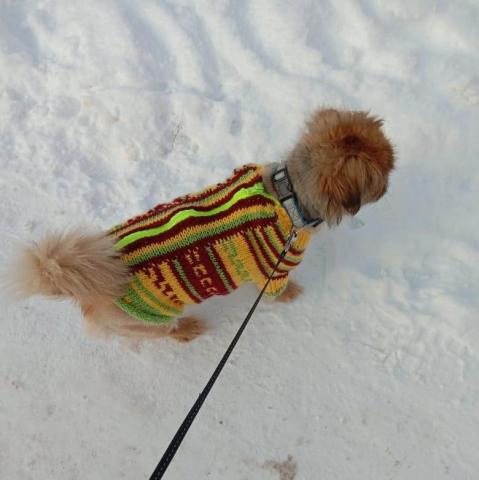 Кстати говоря и дома временами ему свитер одеваю, чтобы не мерз. Дома можно и плотный использовать, тк он не бегает так много как на прогулке.