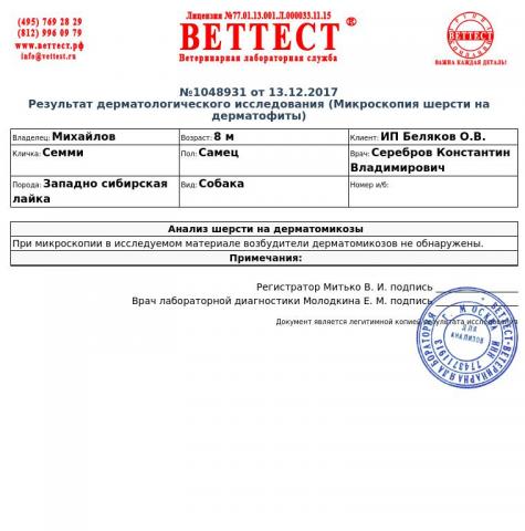 Кобель 9 месяцев западно-сибирская лайка. Живет на улице в вольере. Утром и вечером прогулки не менее одного часа. Кормлю сухой корм холистик Грандорф. Собака привита, регулярные обработки от клещей и блох. Около трех месяцев назад образовалась рана на левой передней лапе. До сих пор не заживает. По совету ветврача делали новокоиновую блокаду с преднизолоном. перепробывали мази: ловомеколь, Антидерм ГК, бепантен, гидрокортизон. Мазали фуракцином. Не помогает. Чтобы не разлизывал рану постоянно в пластиковом воротнике, повязка на лапе. Делали анализы на дерматомикозы - отрицательно. Делали биопсию.