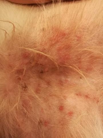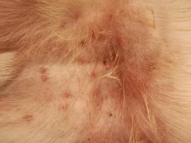 Здравствуйте.У нас ещё одна проблема появилась:на пузе(только справа),нигде больше, появились высыпания.Я особо не обращала внимания,но,скорее всего,пару дней назад.Ел натуральную пищу(каша с мясом,творог,кефир).В выходные сделали прививки.Барс на холку капала.Вроде ни блох,ни гнид не видно.Сильно линяет,иногда почесывается.Что это может быть и стоит ли бежать к ветеринару?